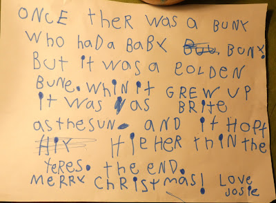 Her mama said she did it all on her own without asking for spelling help. Her spelling is phonetic and rather Elizabethan in that a given word might have several different spellings.